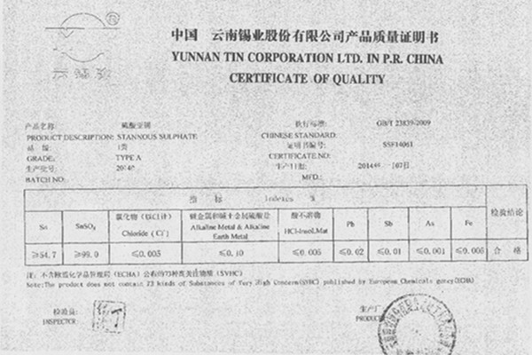 作 用:云南硫酸亞錫純度高,雜質(zhì)少,鉛含量低,主要用于硫酸鹽鍍錫作主鹽使用,印染工業(yè)的媒染劑、雙氧水去除劑等。